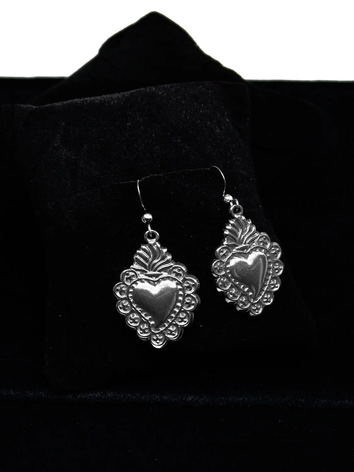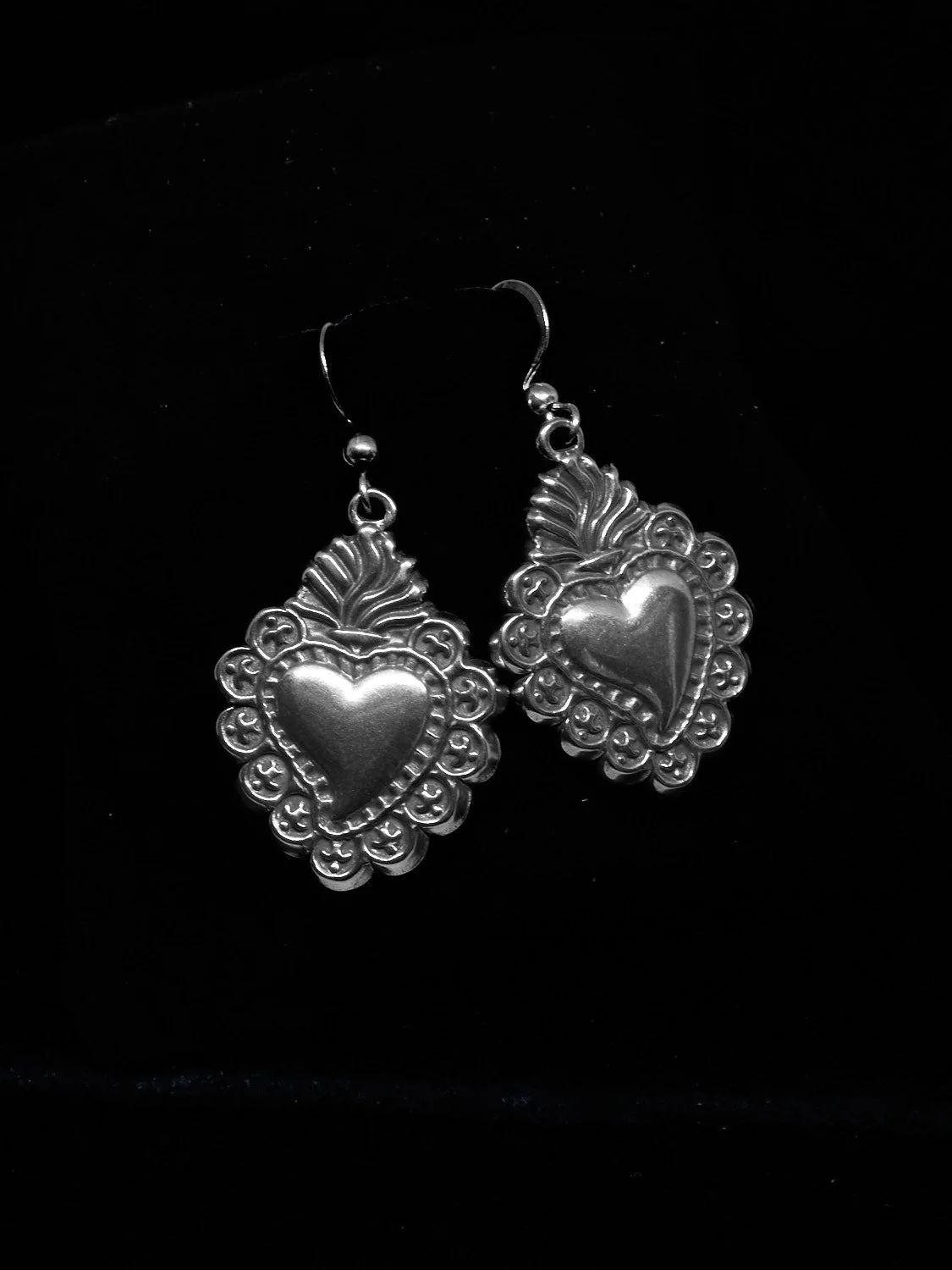 Coppia di orecchini in acciaio con base a monachella classica e pendenti cuori sacri.